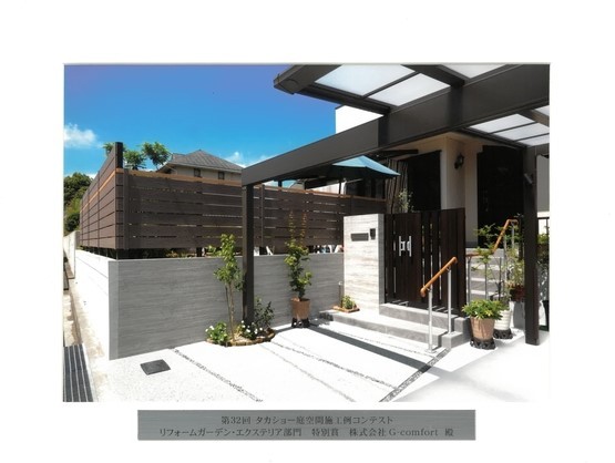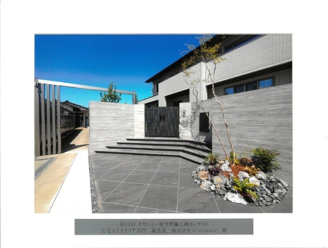 - <div>1枚目:LIXIL・ファサード部門入選賞受賞作品</div><div>2枚目:ファサードの組み合わせで空間に広がりをもたせます</div><div>3枚目:シャープな印象を与える照明演出</div><div>4枚目:カーポートとの一体感が心地よい流れを創り出します</div><div>5枚目:お庭の空間は壁を設けて安心感のあるスペース作り</div><div>6枚目:アプローチタイルもこだわり落ち着いたベージュ色でお客様をお迎えします</div>