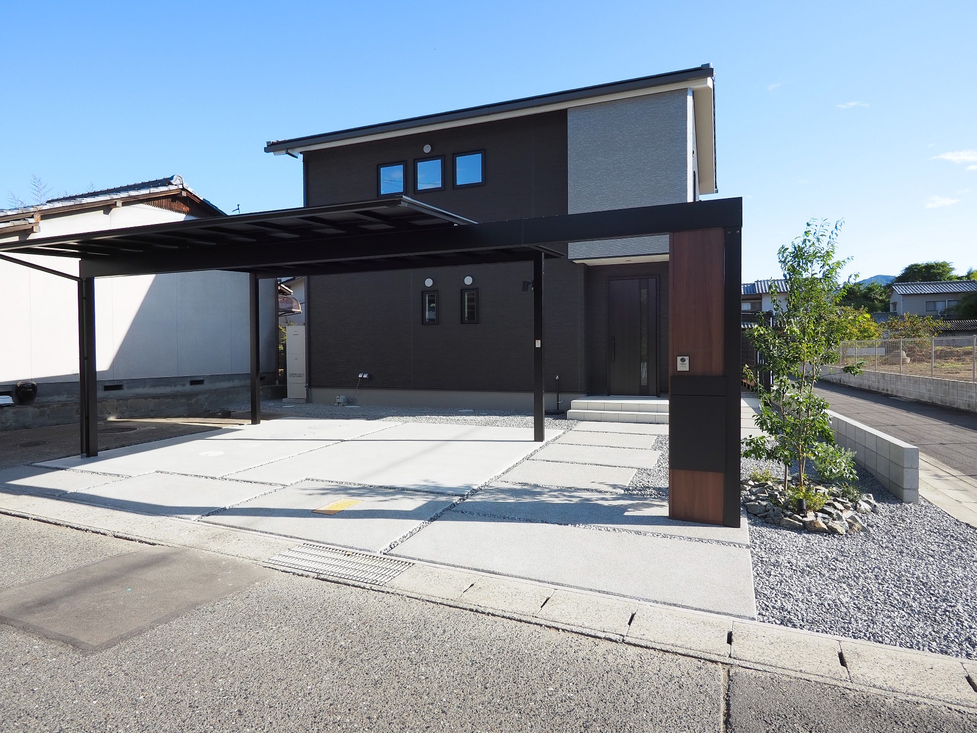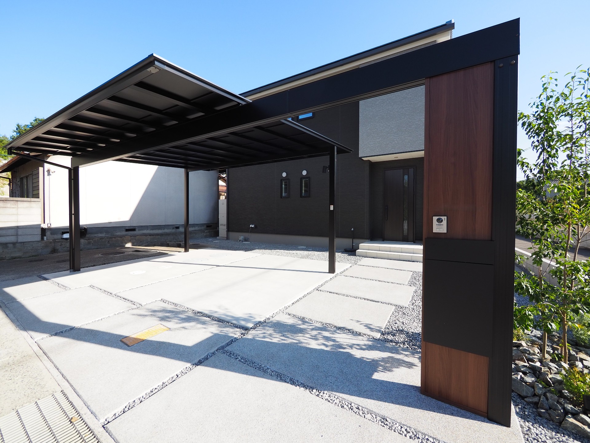 梁延長カーポートとプラスGの門柱が一体となり、重厚感と洗練されたデザイン性を演出したファサード。