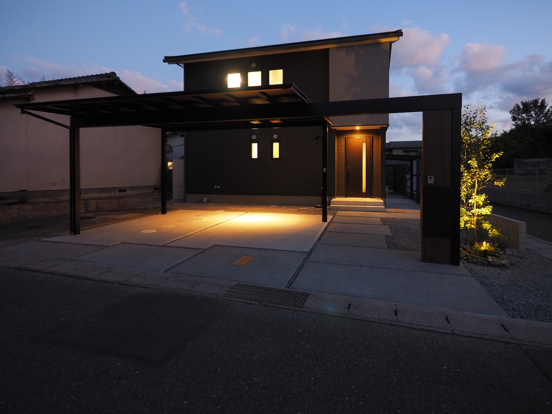広々とした駐車スペースは使い勝手にも優れ、直線的なラインが建物全体を引き締めます。