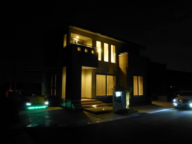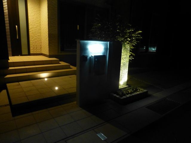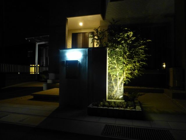 4枚目:夜はアップライトの照明で植栽とガラスを照らすように