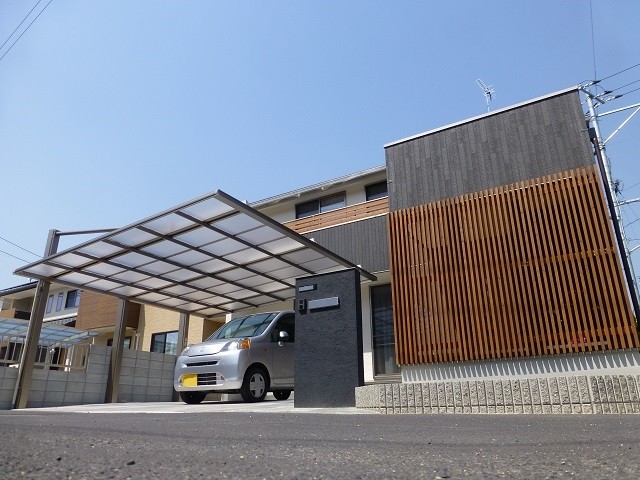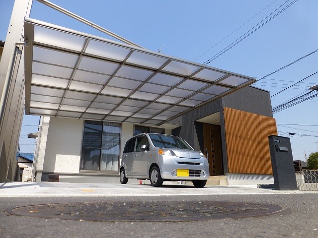 2枚目:カーポートは片側支持のダブルフェースで視界を遮りません