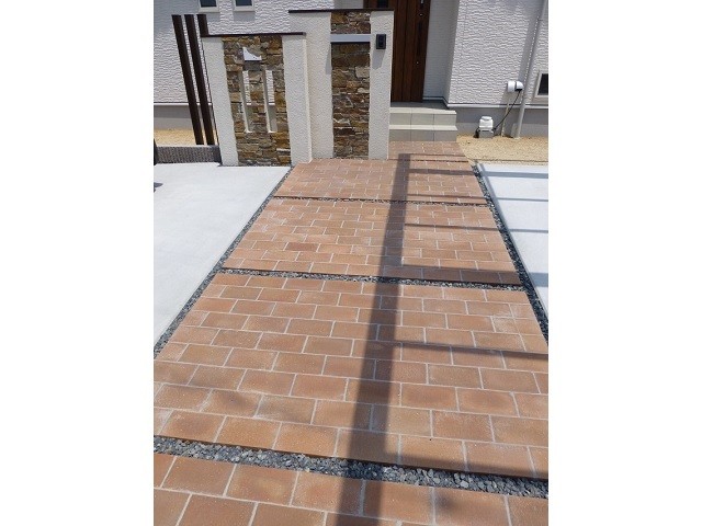 2枚目:サンドフェイス加工のレンガ・グラヴィブリックペイブをアプローチに使用