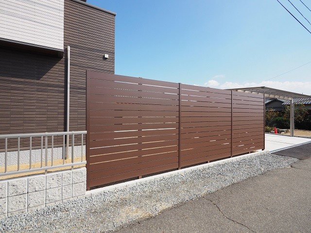 2枚目:中庭の目隠しは木目調のフェンスで温もりのある印象に