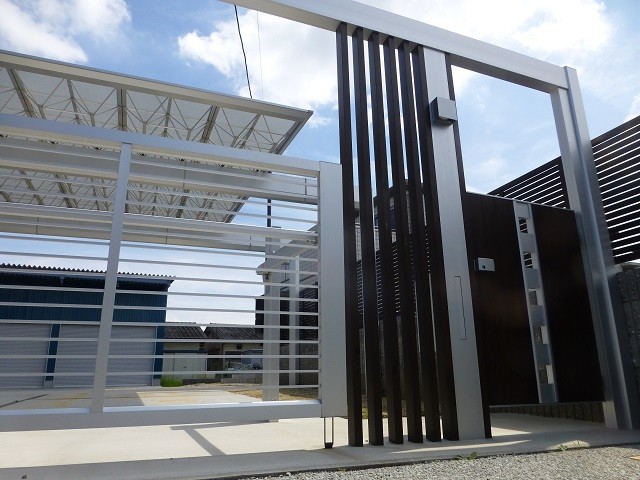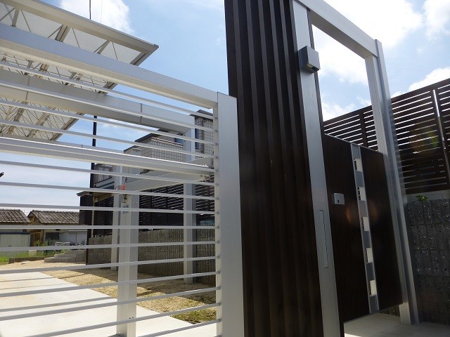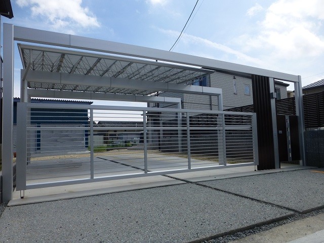 2枚目:跳ね上げ門扉にラビーネ、カーポートにMシェード、ゲートをMグローリアで施工しました