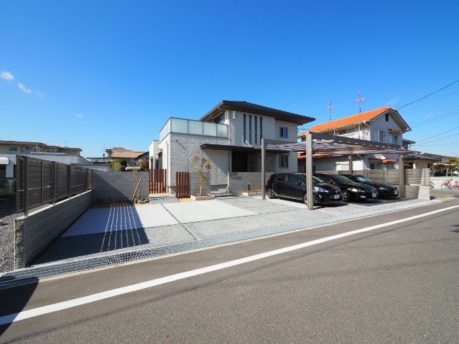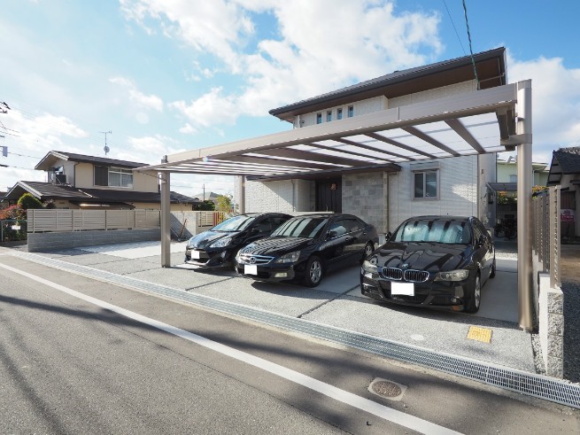 4枚目:お庭にかけての目隠しは枕木材を使いカーポートとの統一感を