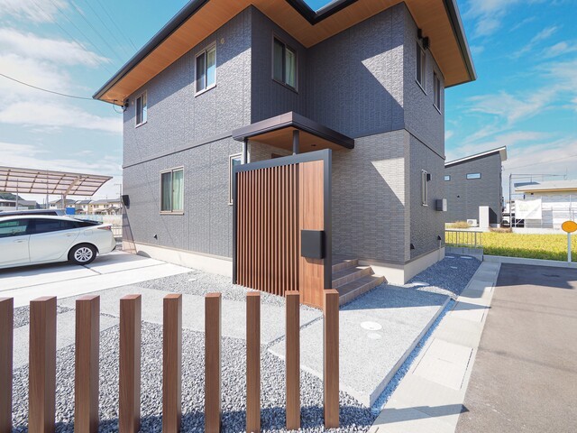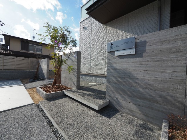- <div>1枚目:重厚感ある杉板コンクリート風のタイルを使った門廻り</div><div>2枚目:建物との調和がとれている外構</div><div>3枚目:ロックガーデン風の植栽がおしゃれ</div><div>4枚目:敷地廻りもフェンスで囲い、防犯対策もばっちりです</div>