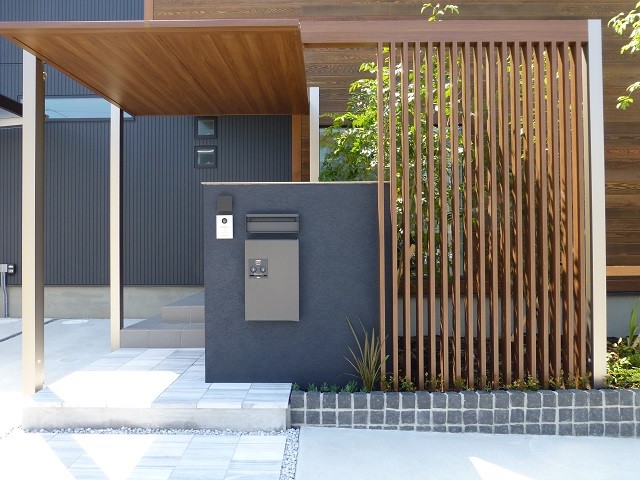 - <div>1枚目:屋根のあるアプローチ</div><div>2枚目:カーポートからの雨除けとしても効果的</div><div>3枚目:黒塗りの門柱と洗い出し仕上げの相性が良いです</div><div>4枚目:目隠ししながらも重たい印象にならないようにスリットや格子を入れます</div><div>5枚目:階段のアプローチで高低差の解消をしました</div>