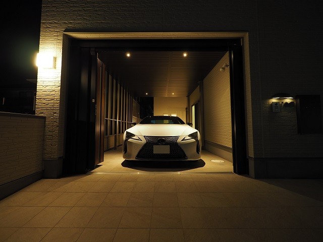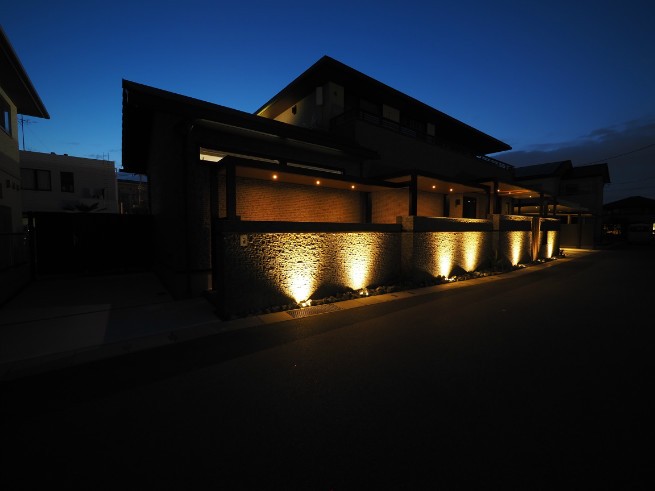 - <div>1枚目:ライトアップによる門袖の陰影が素敵ですね</div><div>2枚目:夜は照明もバッチリ</div><div>3枚目:三協アルミのUスタイルアゼストも木調の天井材で統一感を</div><div>4枚目:カーポート内は夜も明るく安全性と利便性を向上</div>