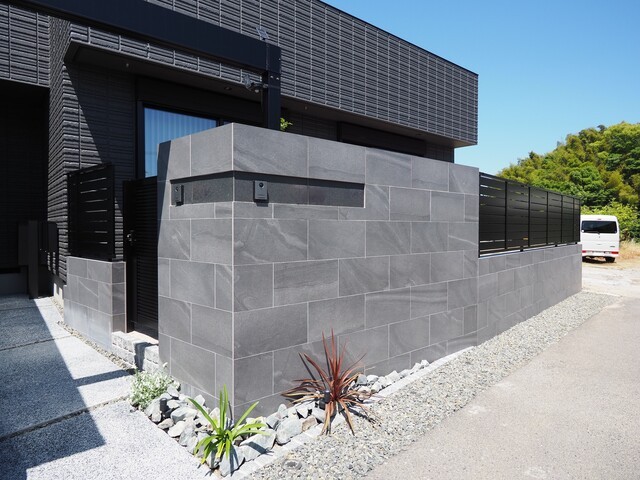 - <div>1枚目:クローズド外構で重厚な外観に</div><div>2枚目:石貼りの門構え</div><div>3枚目:角には植栽スペースを作って有効活用</div><div>4枚目:TOYOのオークルストーン乱形貼で横へと続くアプローチ</div><div>5枚目:お庭はインターロッキング仕上げで</div>