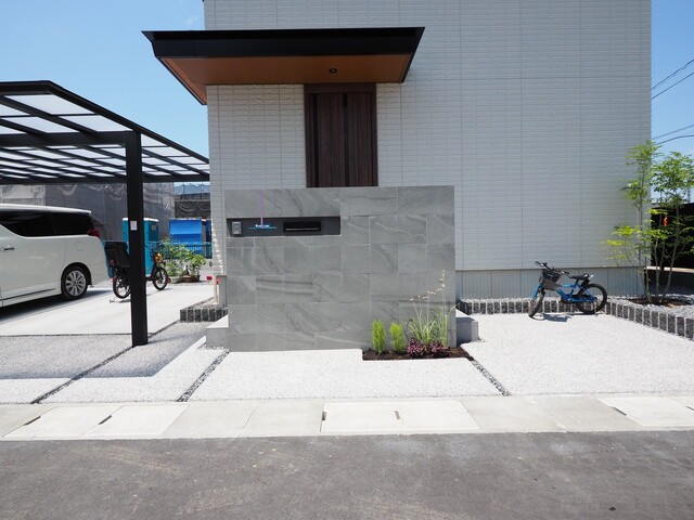 - <div>1枚目:グレーのタイルがガルバの建物に映える門柱</div><div>2枚目:ブラックポリカがかっこいいスタイリッシュがカーポート</div>