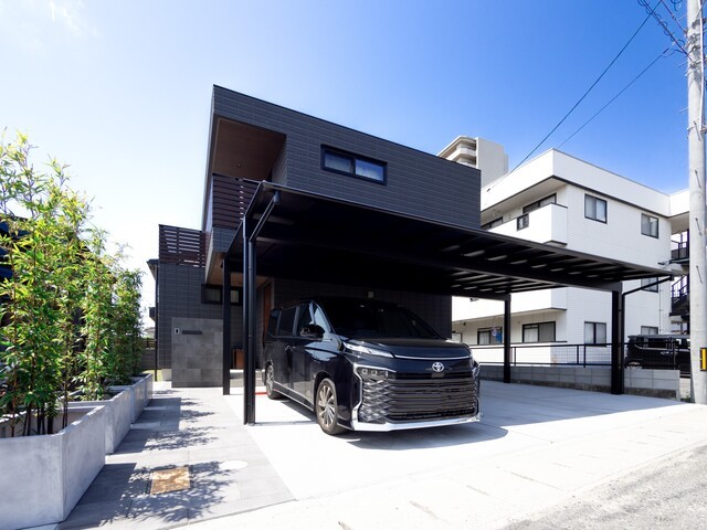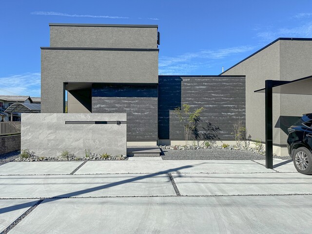 - <div>1枚目:建物とのバランスが良い比率の門柱</div><div>2枚目:黒いタイルのラインがアクセント</div><div>3枚目:アプローチは浮かし階段を広めに設置</div><div>4枚目:カーポートSCのオールブラックを使用</div><div>5枚目:玄関前もアプローチと同タイルを使用して統一感◎</div>