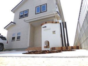 アプローチの縁取りと門柱はTOYOのプリウスブリックで可愛らしく