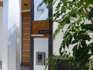 機能門柱は木目とアルミの色使いでスタイリッシュに