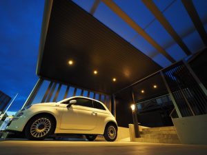 3台用のカーポートに一部天井材を取り付けダウンライトで演出しています