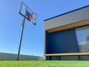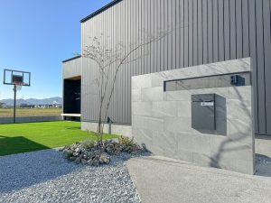 グレーのタイルがガルバの建物に映える門柱